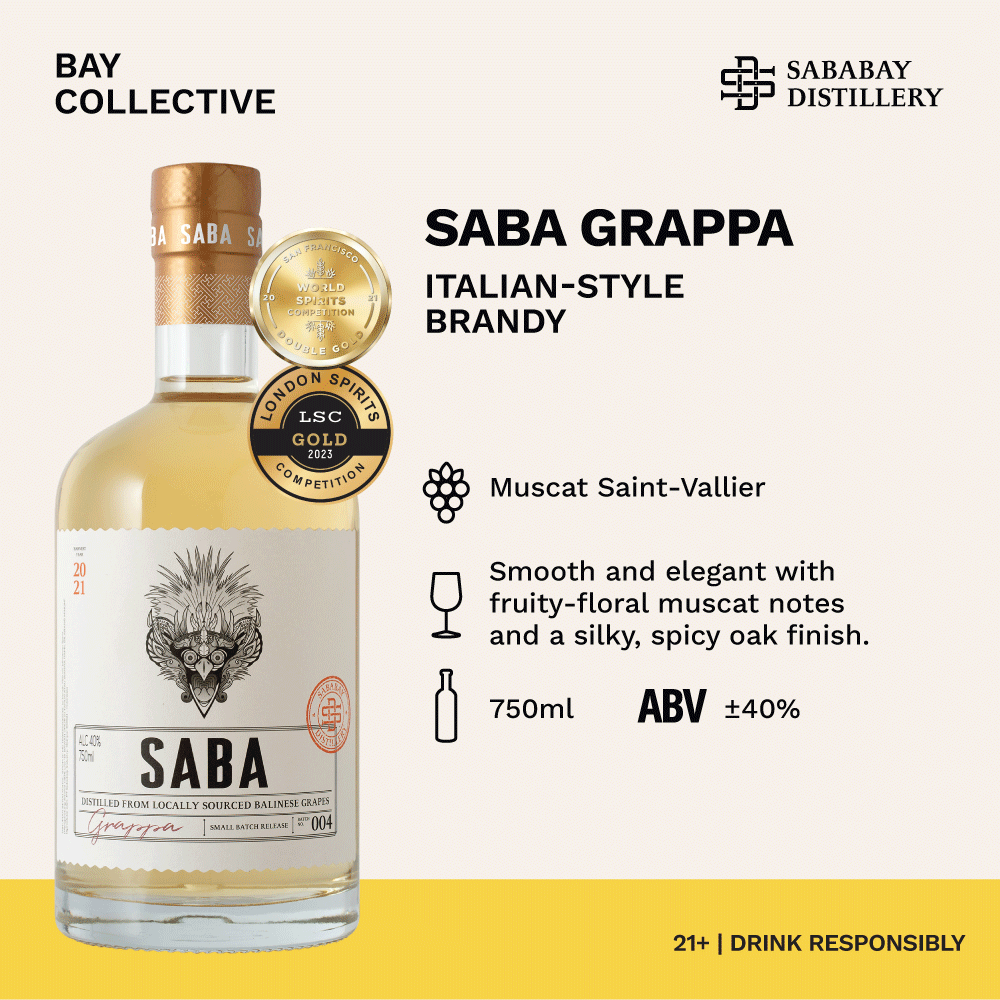SABA Grappa is a handcrafted spirit born from a single mission: to showcase the true character of Balinese grapes. Distilled using a traditional copper alembic, this small-batch grappa preserves the essence of Muscat Saint-Vallier—offering a smooth, floral, and refined taste.